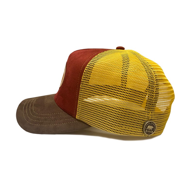 US-TYPE-TYPE-TRUCKER 5-Panel-Cap in Suedine und Jeans mit Broderie K, atmungsaktives Mesh-Modell, hinten mit Snapback gehalten und verstellt.