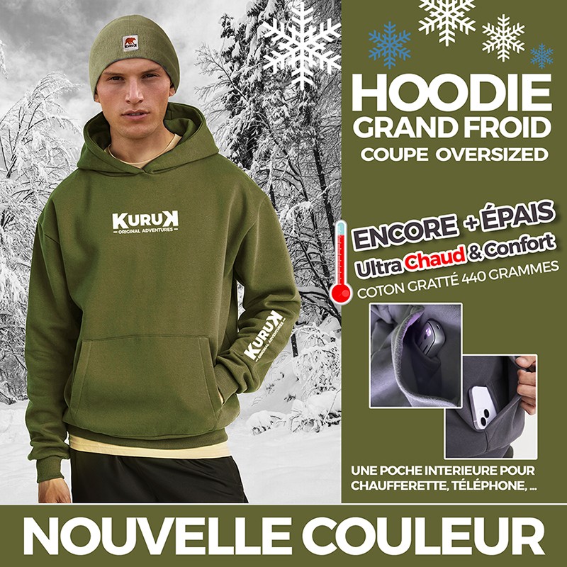 Sweat-shirt 70 % coton ringspun, 30% polyester recyclé - TRES EPAIS (440g/m²) et Chaud ! Kuruk à capuche doublée, sans cordon.