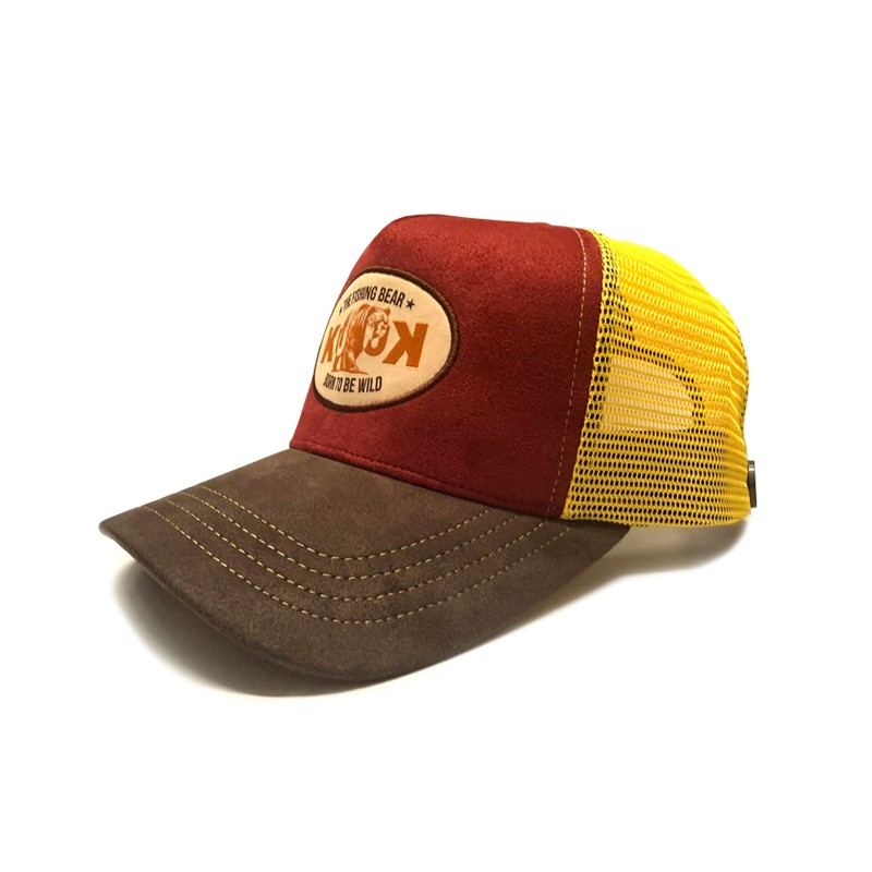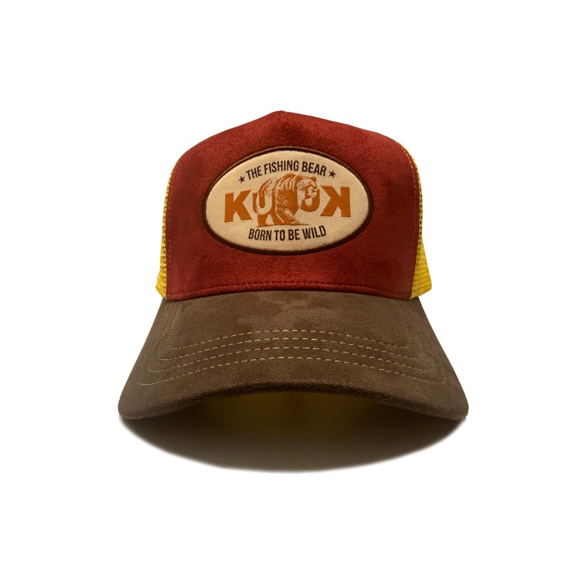 Casquette Trucker 5 panneaux TYPE US en suédine (visière et panneaux) Patch Ours Kodiak, modèle filet respirant, maintien et réglage par un snapback à l'arrière.